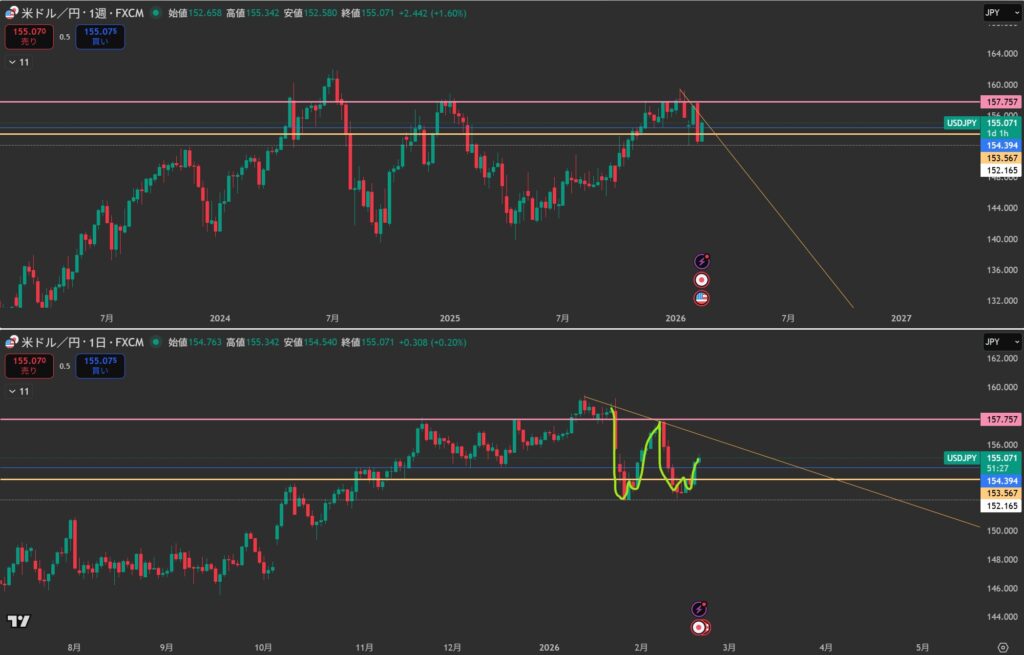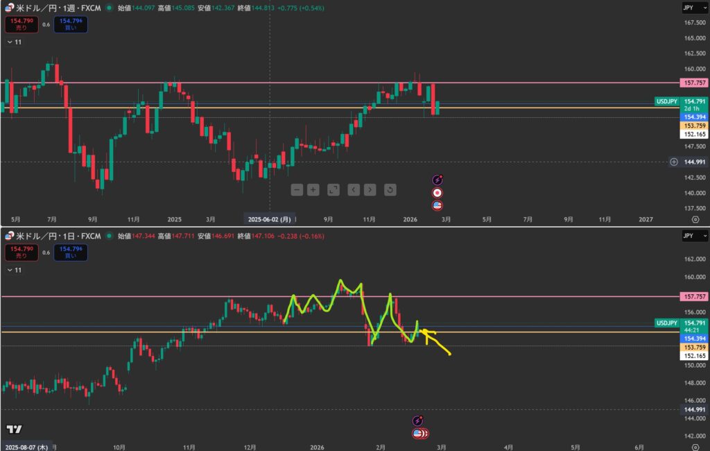 下降になったけど、日足のネックラインにぶつかった。この後どうなるかな。