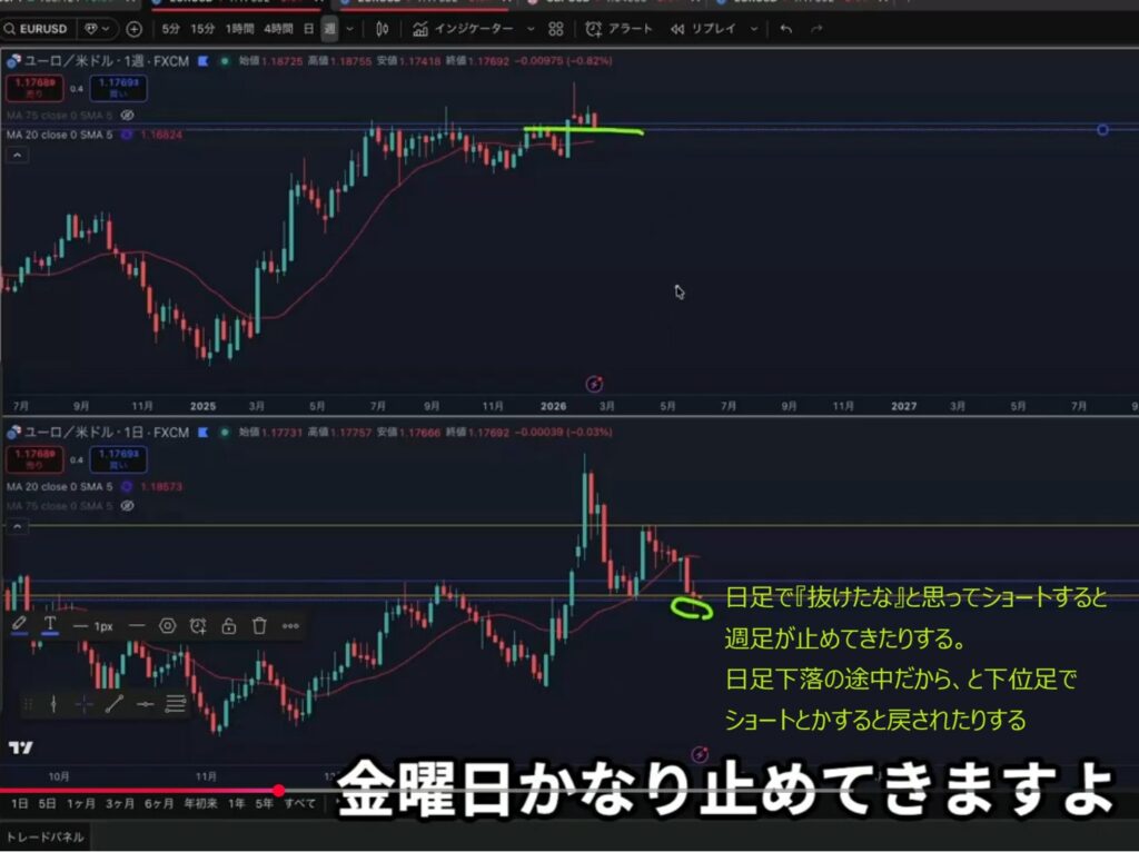日足下落の途中で、ショートすると週足が止めてきたりする。