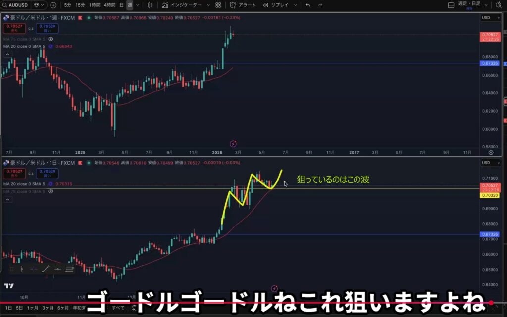 - アドバイスをゆたさんからもらった『波のサイズ感(ダウカウント)・4hのMAの位置・もっと左側を精査しての水平線など』が改善点。やってみます。