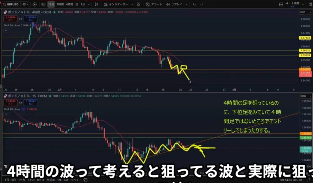 4時間足の波を狙って、下位足(15分)を見て、『ネックライン割れ』と思ってエントリーした時にそもそもの4時間足の波を忘れてしまうこと。