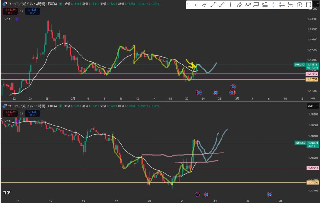 けど、欧州くらいに1Hの押し目&移動平均線に反応して上昇しそうな気がする。