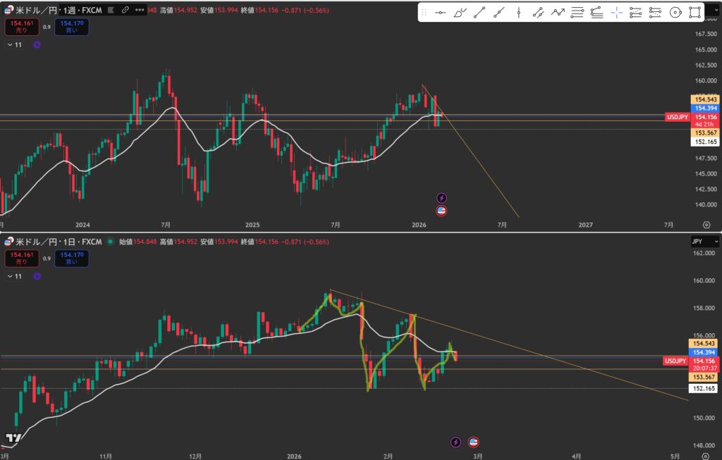 『154.5』に戻りを付けて、日足の移動平均線に支えられて下降しそう。