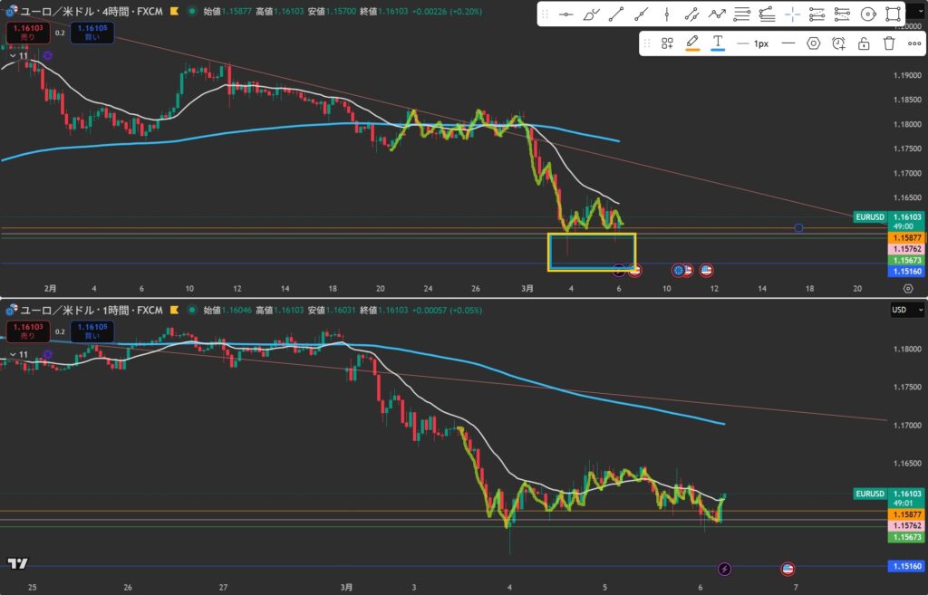 - 4時間と1時間が同時に下抜けしたら”攻防ラインを待つ