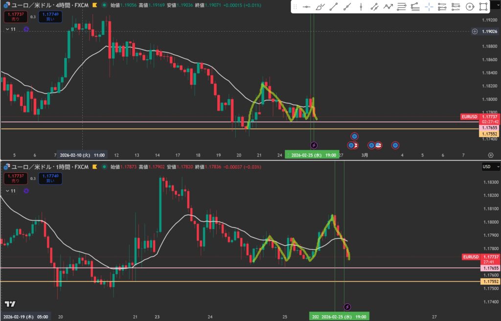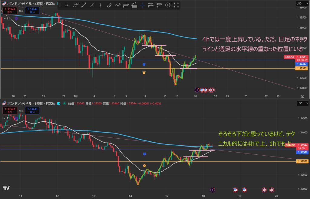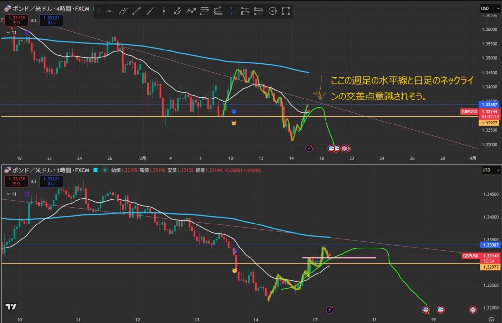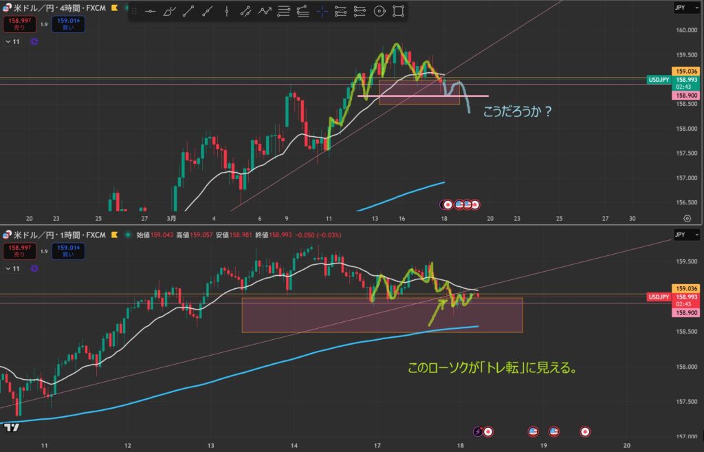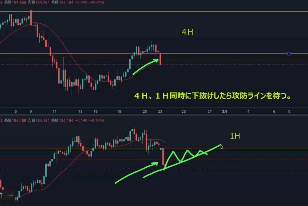 - 4時間と1時間が同時に下抜けしたら”攻防ラインを待つ