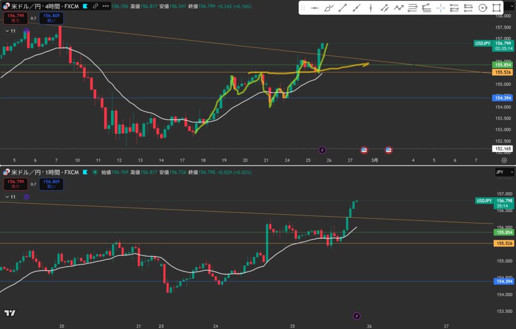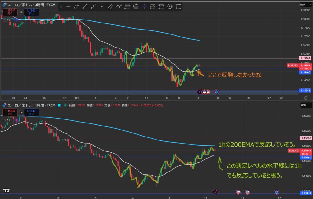 4hでは4hの水平線で支えられているけど1hでは割ってきている。
