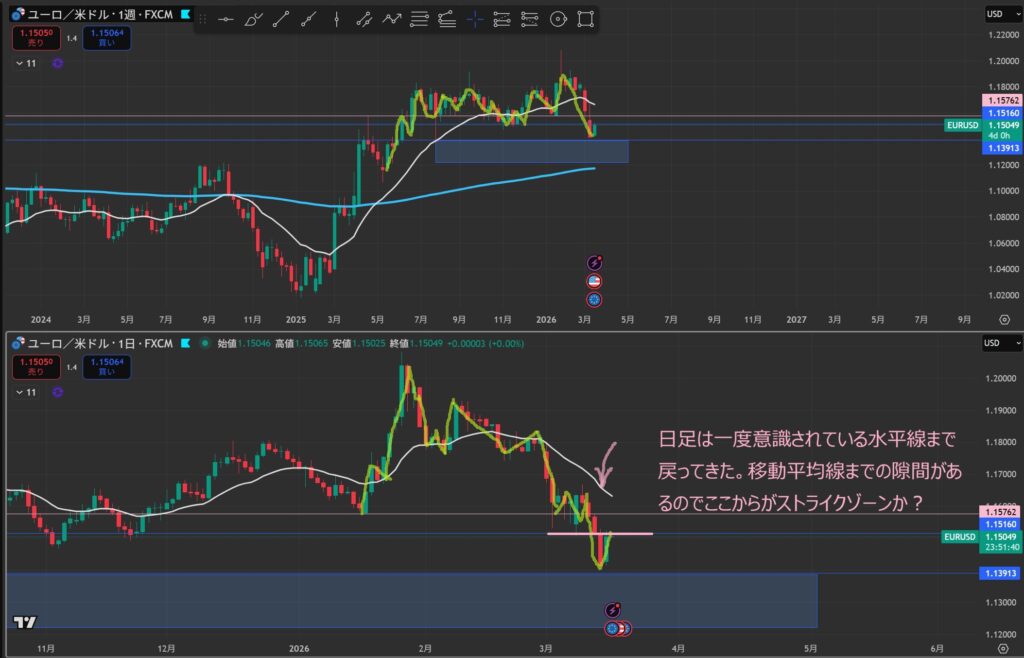 日足:日足は一度意識されている水平線まで戻ってきた。移動平均線までの隙間があるのでここからがストライクゾーンか?