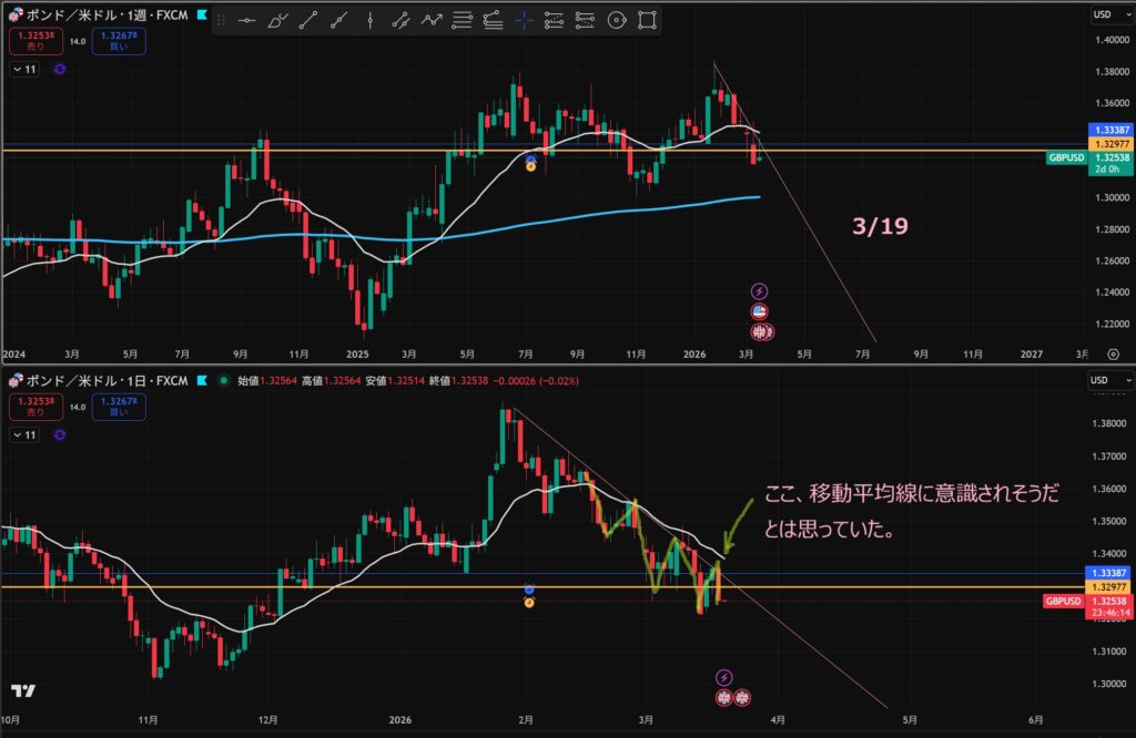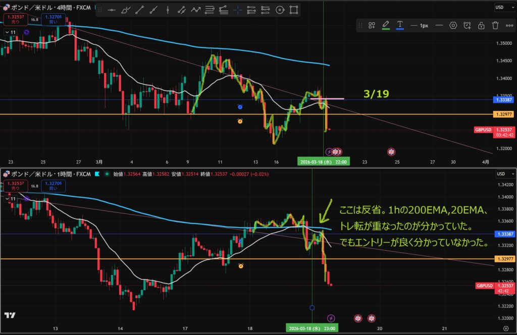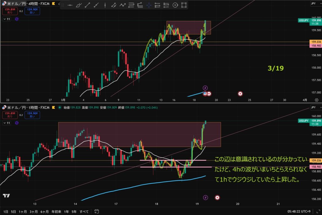 ・方向:下 4hは下だと思っていて(3/18)、上に転じた(3/19)けど、また下(3/20)。