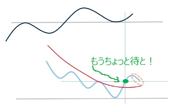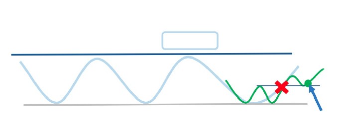 ※ばつ印あたりで抜けてからの1波狙いは損切りになる(波が出ないから当たり前)