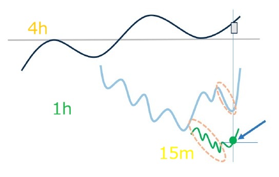 ※ 基本は15分で⾏う。(MTF分析の基本は1時間に15分5波⼊ると仮定すると、15分で反転するところが⾒える)