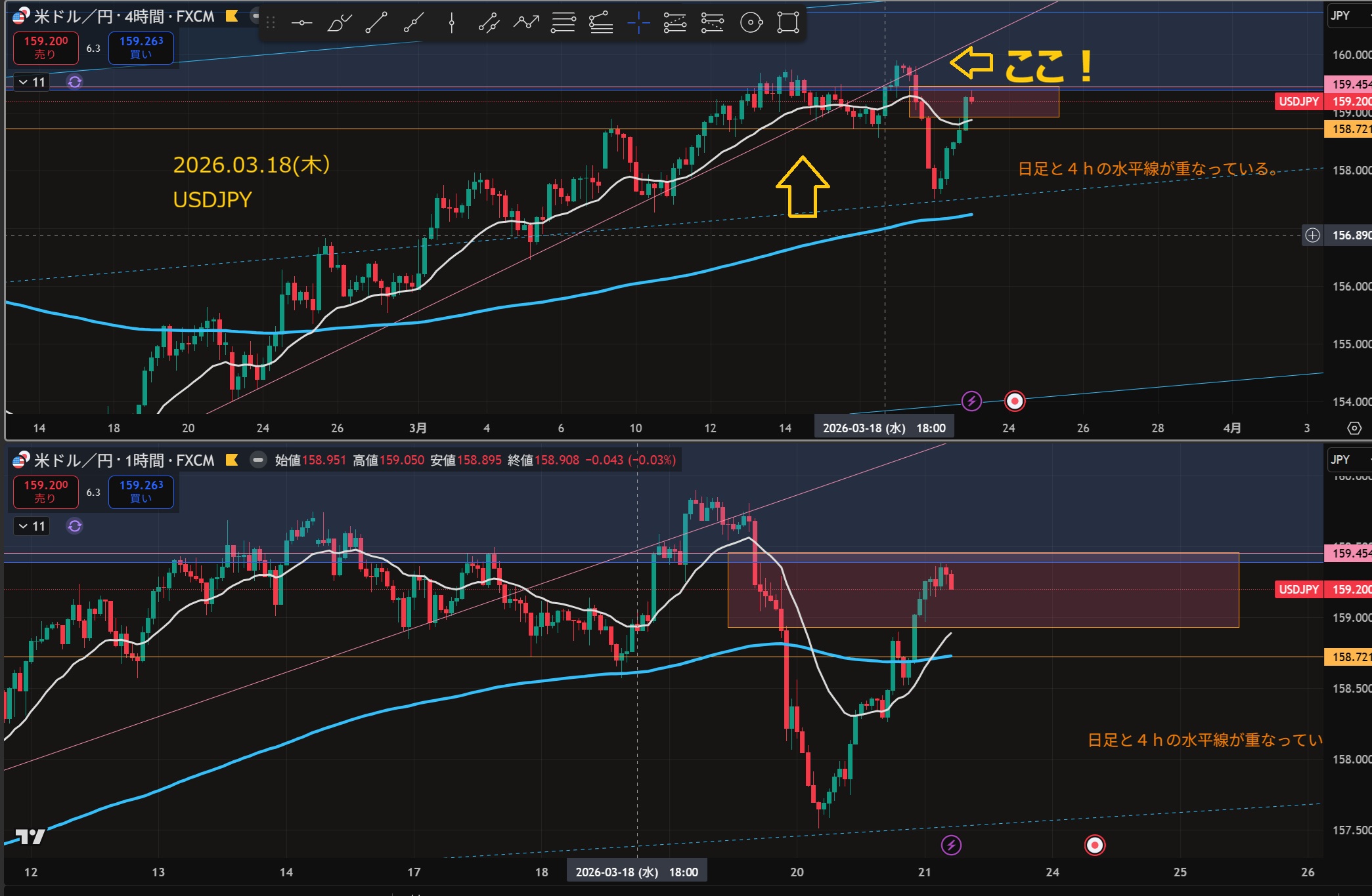 1 上との違いは、1時間⾜がすでに上で節⽬に上のまま押してくる