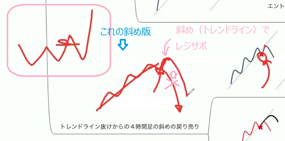 トレンドライン抜けからの4時間⾜の斜めの戻り売り