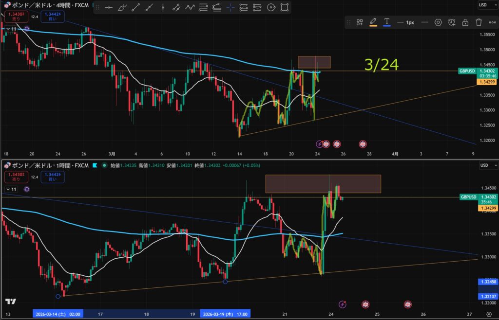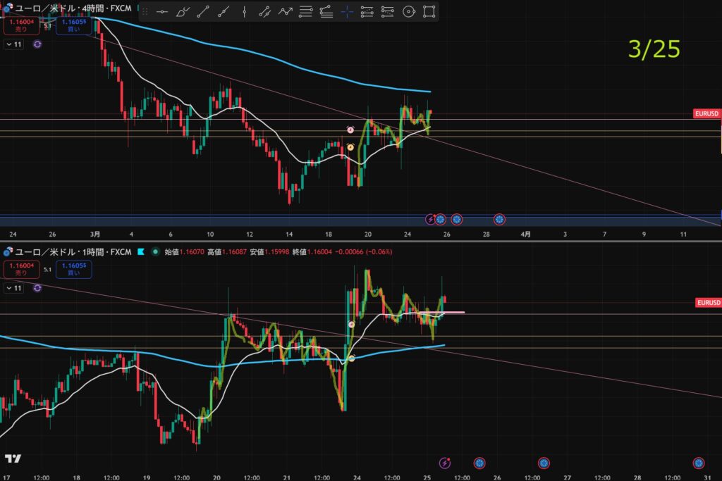- 4時間と1時間が同時に下抜けしたら”攻防ラインを待つ