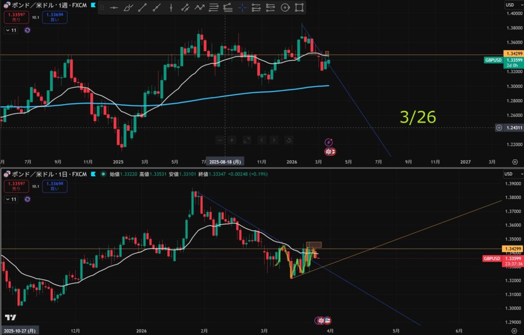 USDJPY:上。週足でレジサポなのか?。 EURUSD:下。日足の移動平均線と少し隙間がある。まだか? GBPUSD:下に抜けた。でもテクニカル的に1h 4h両方上。