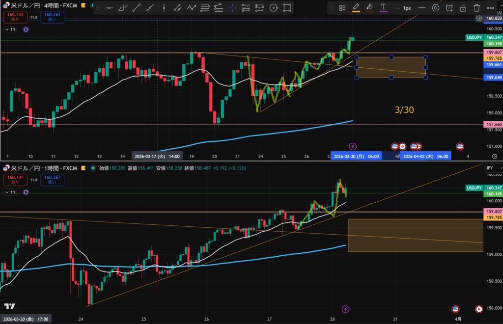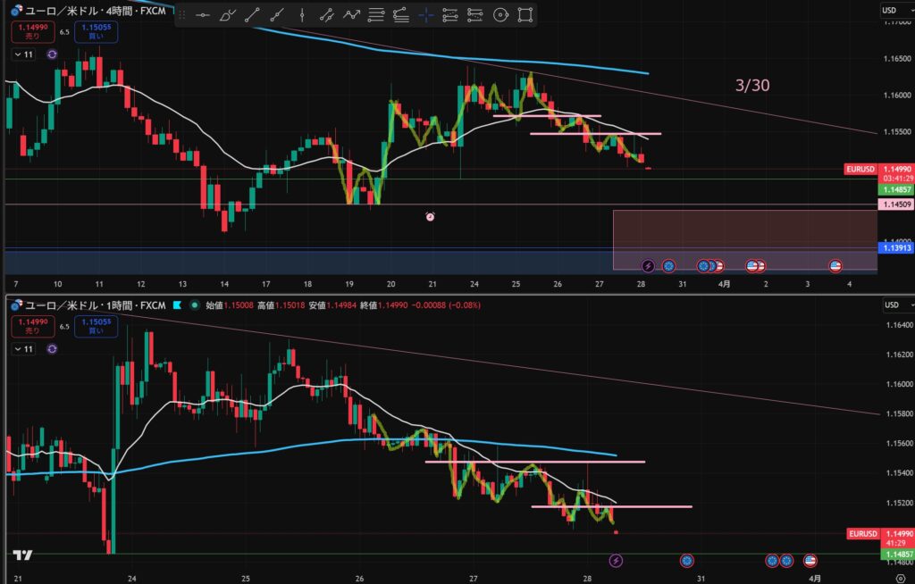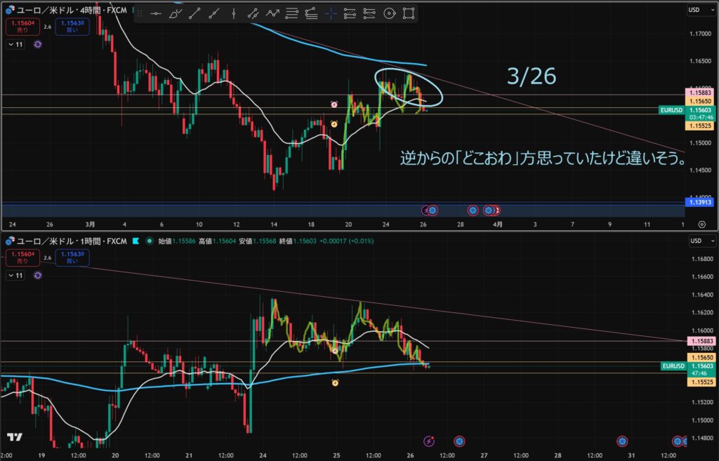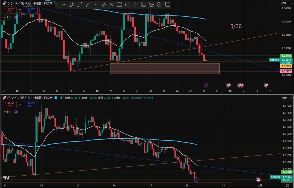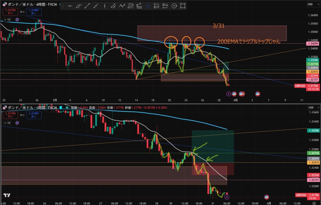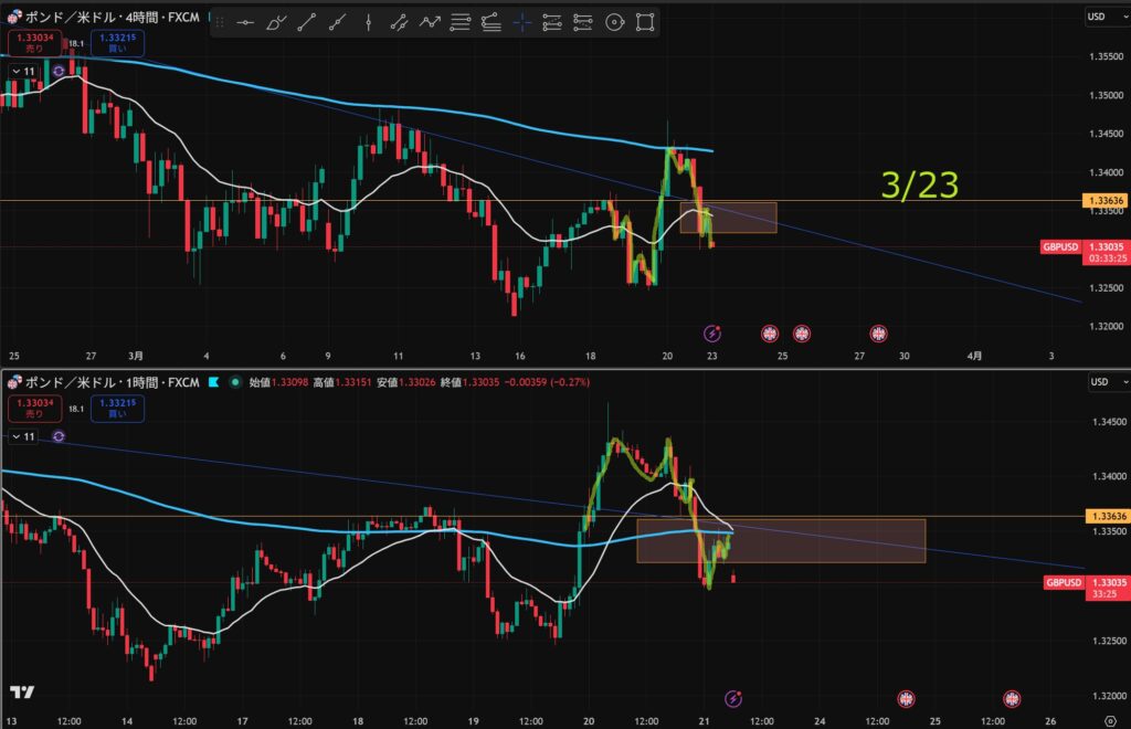- 4時間と1時間が同時に下抜けしたら”攻防ラインを待つ