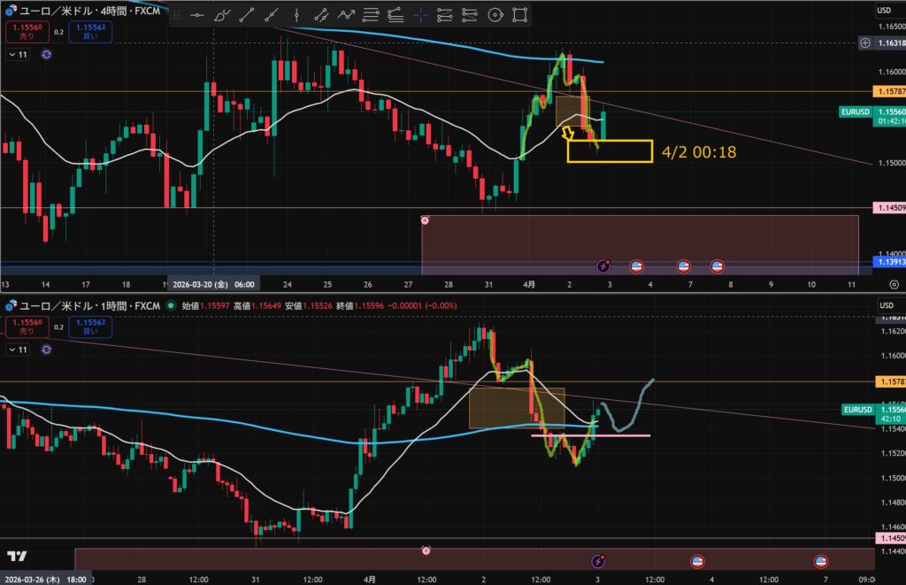 - 4時間と1時間が同時に下抜けしたら”攻防ラインを待つ