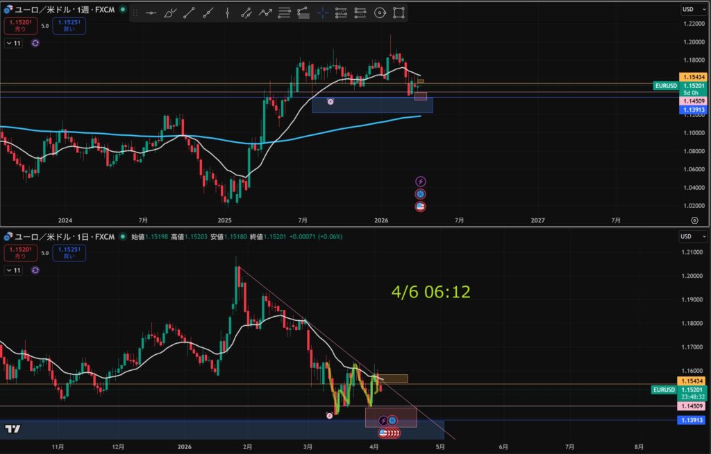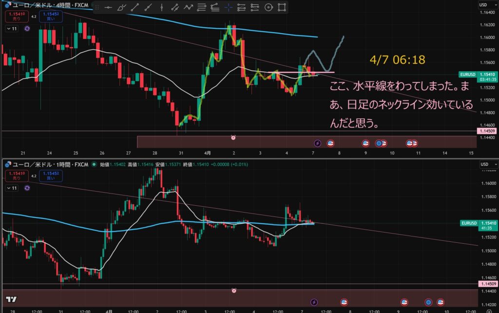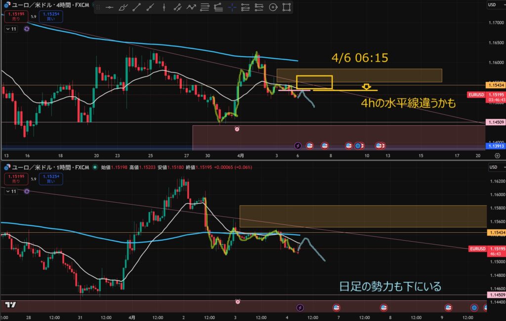 4hの水平線に戻ったら下の日足のネックライン(買い支え勢力)の間で下落?