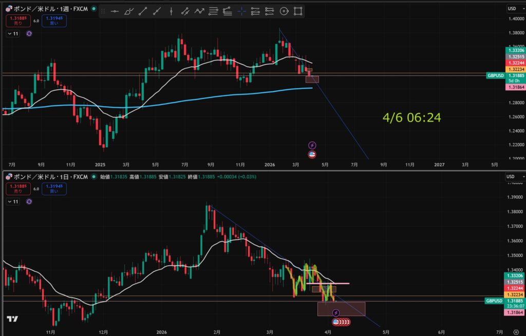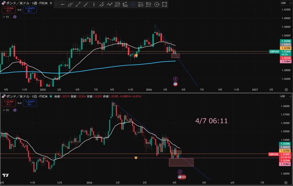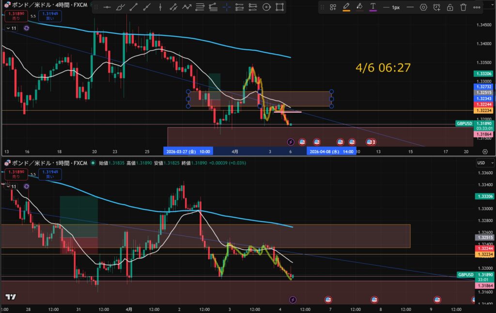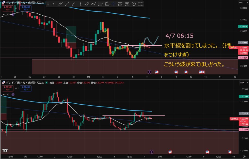 - 4時間と1時間が同時に下抜けしたら”攻防ラインを待つ
