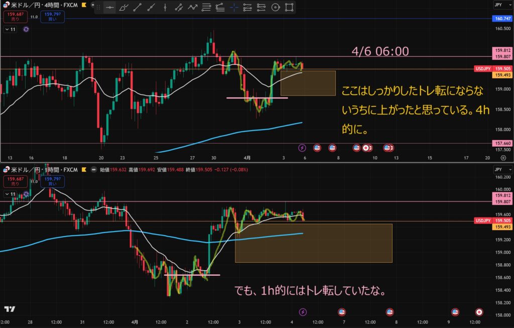 1hではトレ転になった。でも4hではまだだと思う。4hで波に乗りたい